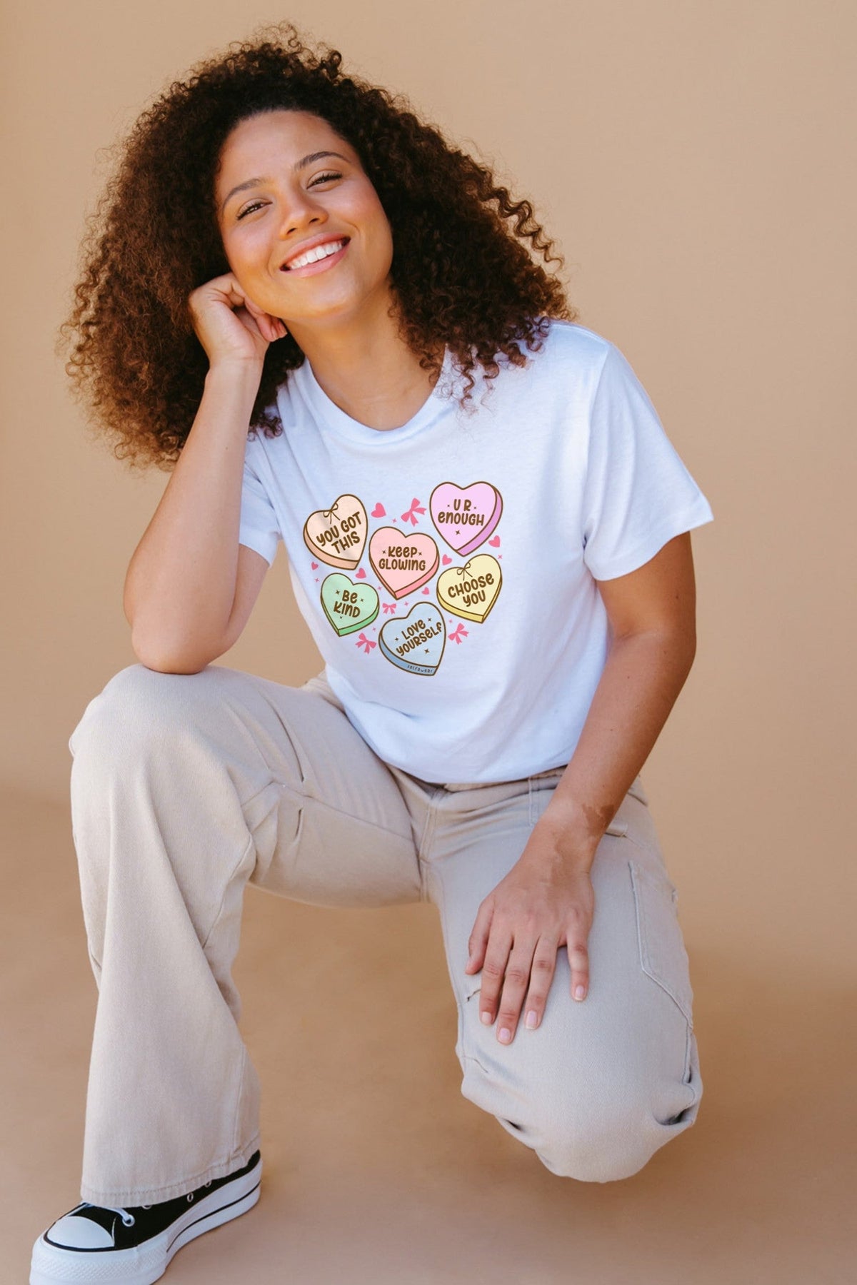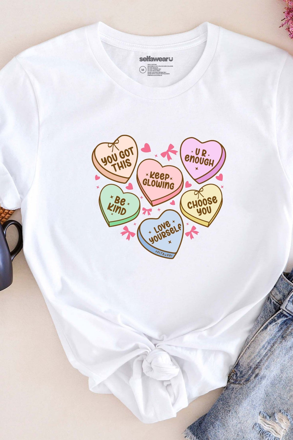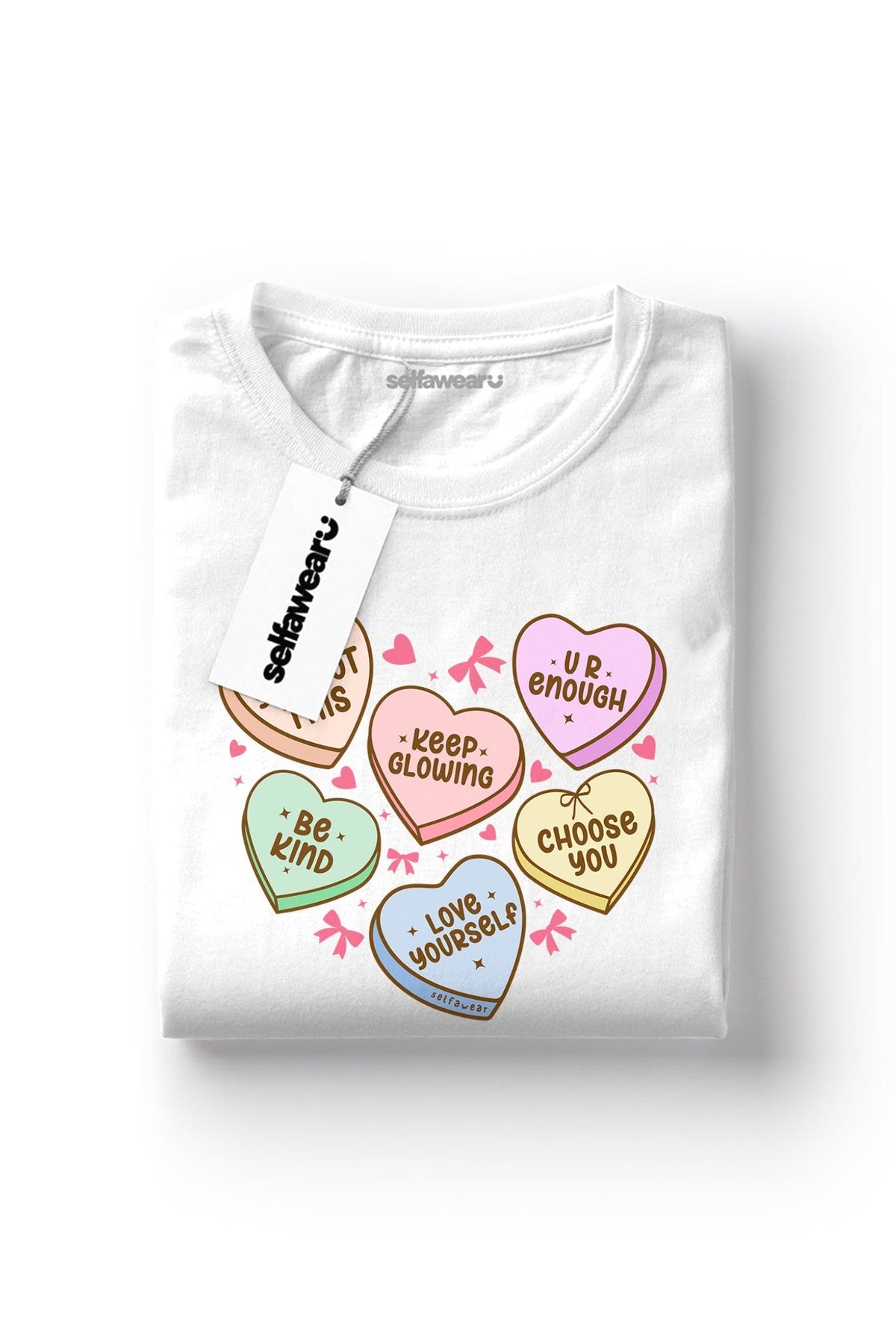 The Candy Tee is a pastel-coloured pick-me-up designed to brighten your day and lift your spirits. Each candy heart carries a dose of Selfawear love — “You got this,” “Keep glowing,” “Be kind,” “Love yourself,” “Choose you,” and “U R enough.”