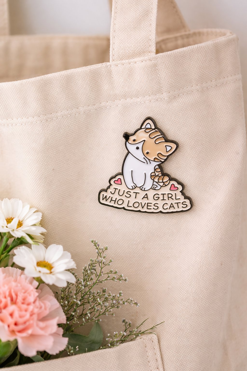 The Just a Girl Pin is a sweet and playful way to celebrate the special bond between a girl and her cats.