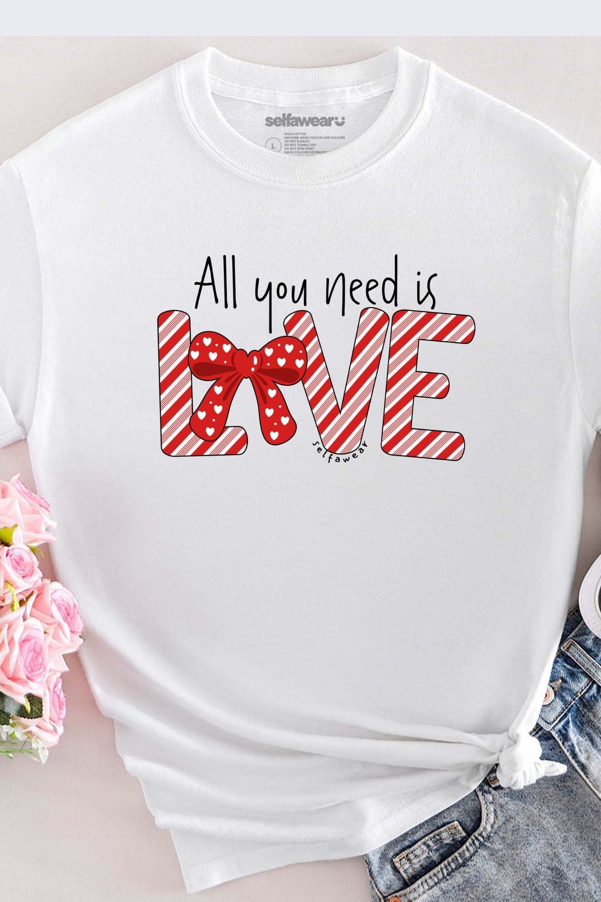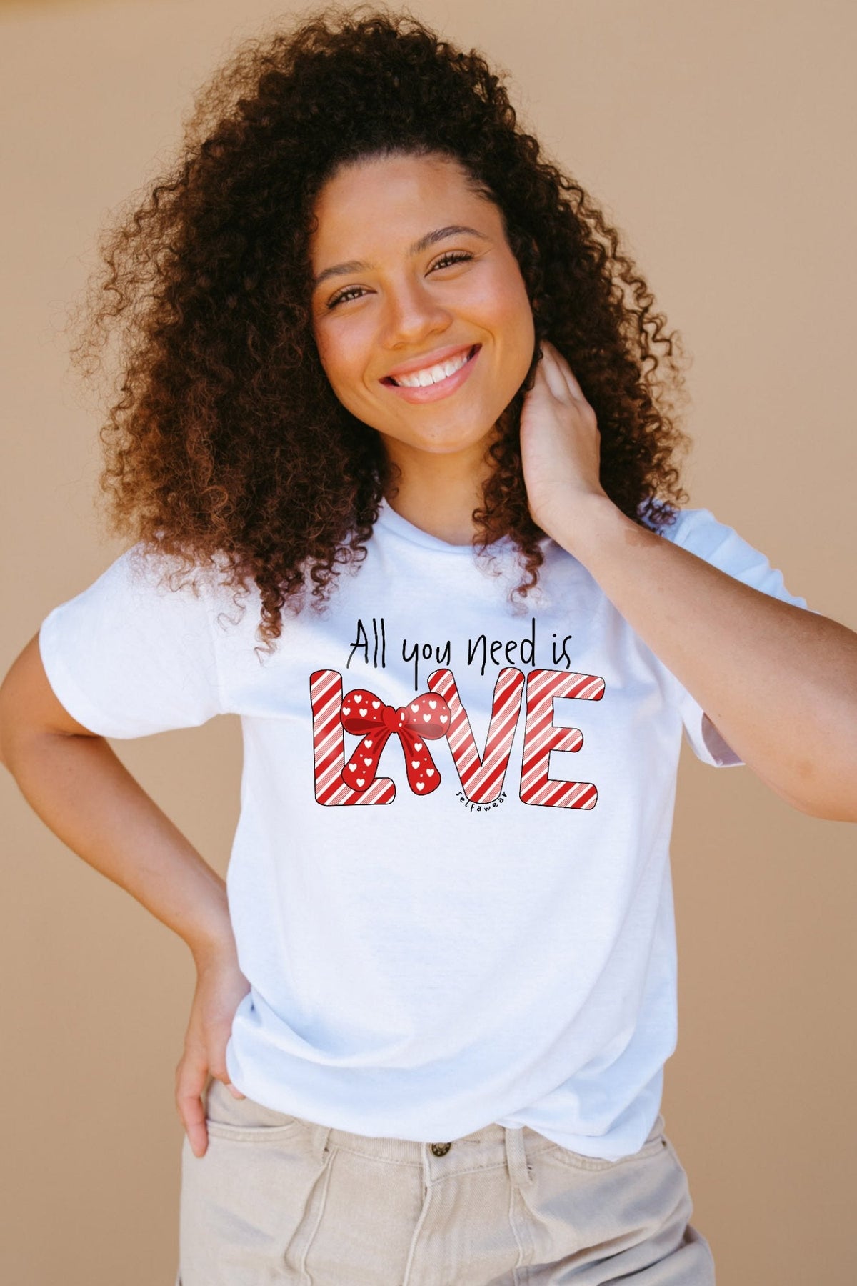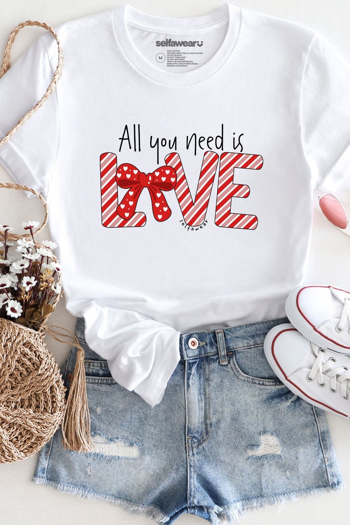 The All You Need Is Love Tee is a bright, feel-good reminder of what truly matters. With its playful candy-stripe lettering and sweet bow detail, this design brings a little joy and lightness to your day — and to anyone who reads it.